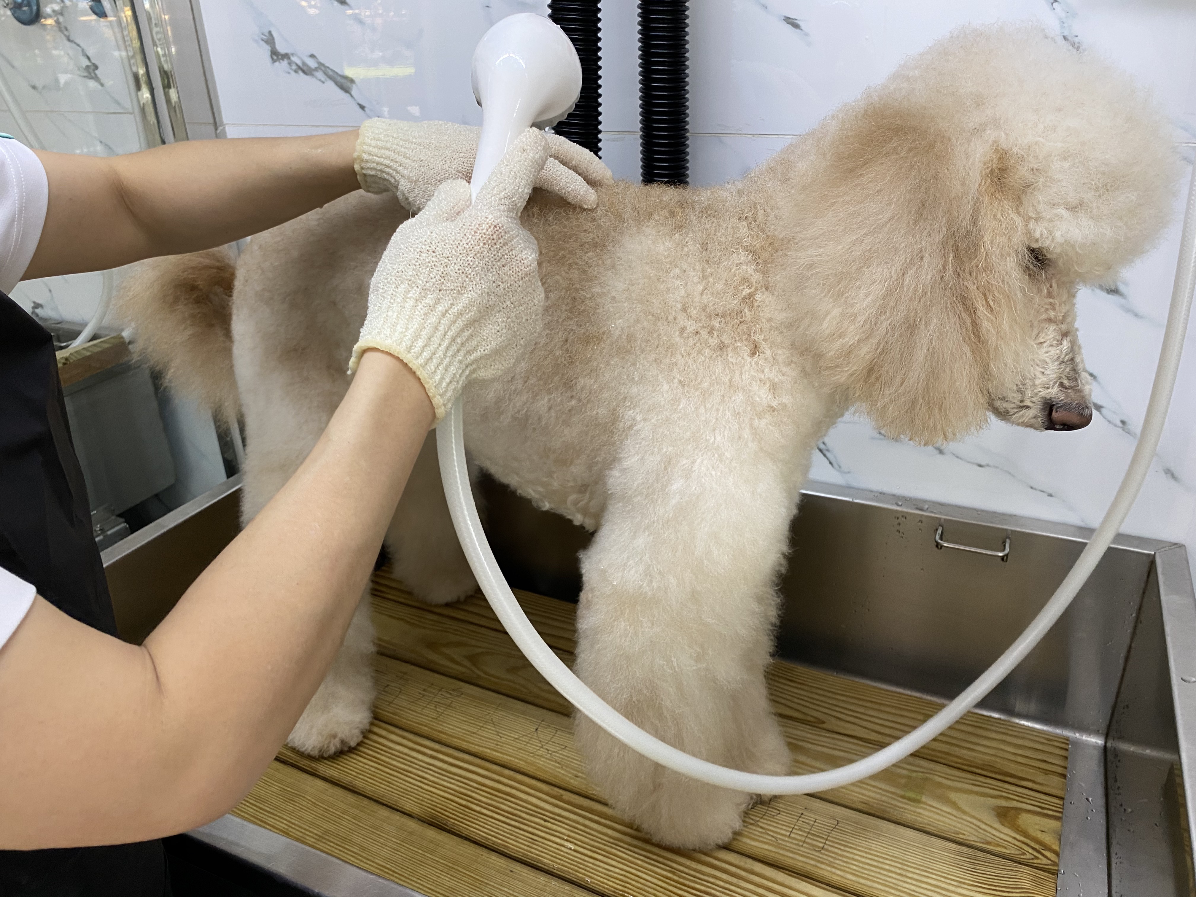 用水淋濕狗狗身體後,戴上沐浴手套,將洗毛劑搓揉起泡
